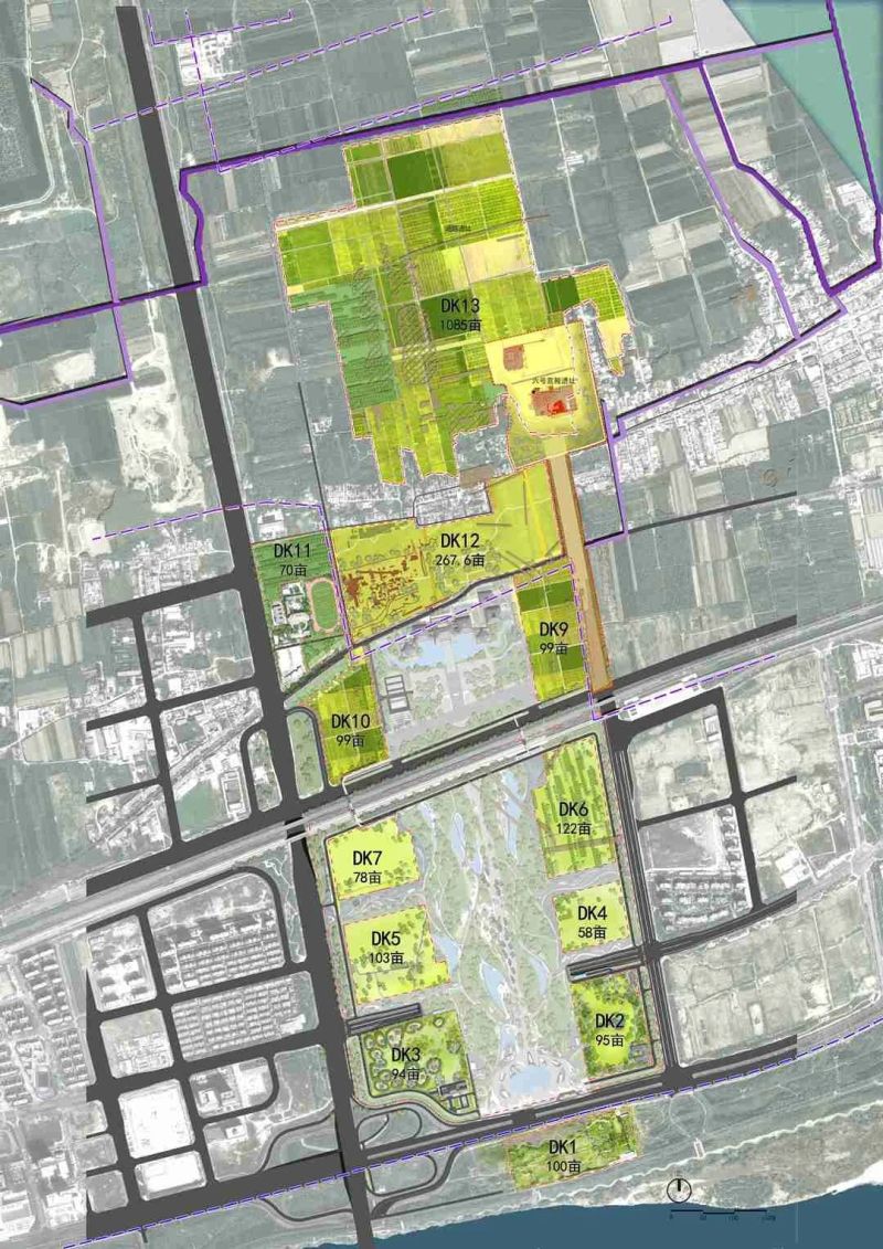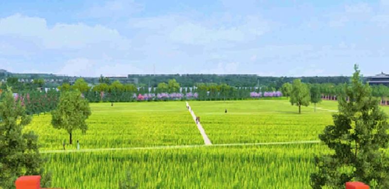 秦咸阳城六号宫殿遗址西北区域,保留现状林地,同时在农田区域大面积种植小麦等农作物,打造“风吹麦浪”千亩大田景观。