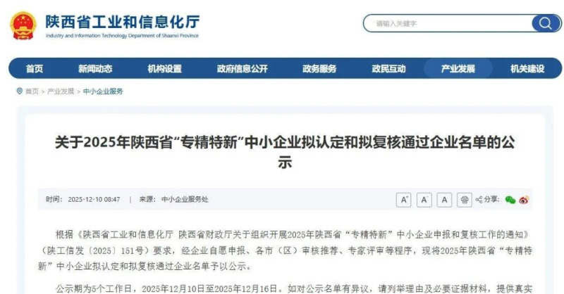 近日,陕西省工业和信息化厅公示了2025年陕西省专精特新中小企业拟认定和拟复核通过企业名单,泾河新城11家企业入选,2家企业通过复核。