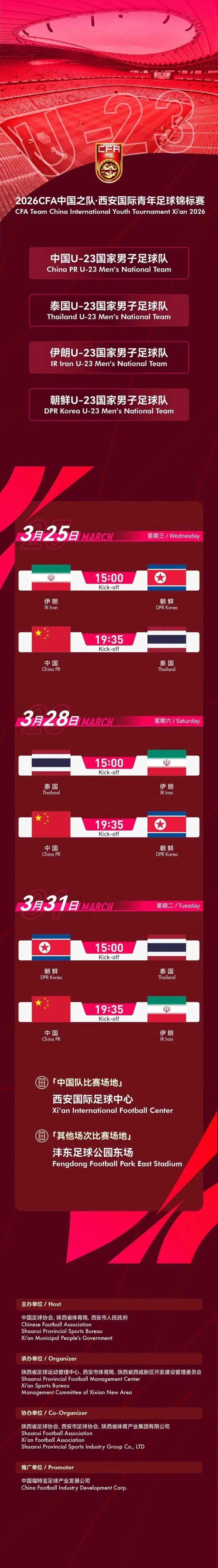 据了解,2026CFA中国之队·西安国际青年足球锦标赛属于国际B级赛,总共有四支球队参加。除了中国U-23国家男子足球队之外,还有泰国U-23国家男子足球队、伊朗U-23国家男子足球队、朝鲜U-23国家男子足球队。按照赛程: